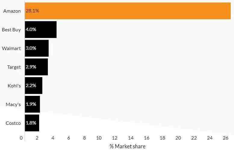 虽然亚马逊今年黑色星期五的市场份额仍然是第一,但和自己相比,还是下降了的——去年黑色星期五,亚马逊一共占了25.7%的市场份额。