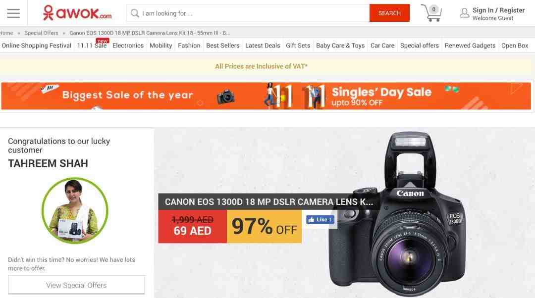 Awok双十一的促销首页面上出现了一个佳能相机仅售69AED的图片,同时还展示了一个幸运奖获得者的图片和名字,看起来让人信服。