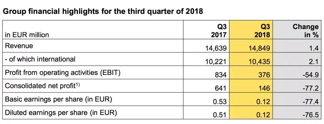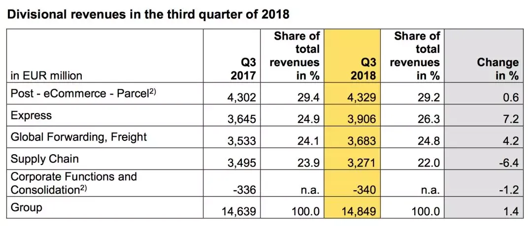 第三季度集团利润增长了4.7%,达148亿欧元;2018和2020年的收益目标确定。 首席执行官安鹏表示: 我们相信我们能够实现2018年和2020年的收益目标。 集团第三季度收入增长至148亿欧元,有机增长4.7% DHL各部门持续其良好表现,提升邮政-电子商务-包裹(PeP)盈利能力的各项措施已在实施中 集团第三季度息税前利润受到了PeP业务单元计划的一次性支出的影响,为3.76亿欧元,低于去年同期,与预测情况相符 首席执行官安鹏表示:“我们相信我们能够实现2018年和2020年的收益目标。” 德国邮政敦豪集团第三季度保持增长势头,为实现2018年全年利润目标打下良好基础。在2018年7月到9月,集团收入比去年同期增长148亿欧元。剔除汇率和资产组合变化影响后,收入增长了4.7%。快递、全球货运部门的显著增长,对集团有机收入增长贡献较大,而蓬勃发展的电子商务业务和国际贸易流量的发展势头也是集团有机收入显著上升的重要原因。集团第三季度的息税前利润为3.76亿欧元。尽管低于去年的8.34亿欧元,但与集团预测相符。DHL 基本上所有部门息税前利润都有增长,其中一些部门增长显著;但PeP部门的收益要低于去年,收益降低的原因是由提升盈利能力的相关措施所带来的一次性支出,这些支出都已在计划中且经过了商讨。在上次6月公布的2018年约5亿欧元的重组成本,集团在第三季度实现了3.92亿欧元。调整后,集团的息税前利润为7.68亿欧元。此外,集团已使用了每年计划投资额1.5亿欧元中的4500万欧元,用于提高生产力。 德国邮政DHL集团首席执行官安鹏表示: 德国邮政敦豪集团在基本增长动力方面保持良好。DHL快递、全球货运和供应链部门的优异表现尤其突出。我们将以坚定的决心解决PeP部门面临的挑战,并且在已拟定的提升生产力和改进成本结构的措施实行中也取得了良好进展。我们的努力结果将在来年清晰可见。尽管最近几个月贸易纠纷和货币波动等宏观经济风险因素增加,但我们相信我们将能够实现2018年和2020年的收益目标。 邮政-电子商务-包裹业务单元2018年第三季度收入增长0.6%至43亿欧元。德国包裹、欧洲包裹和电子商务业务部的显著收入增长弥补了邮政部门的下降。 2018年第三季度德国包裹业务部的收入增长了6.7%,欧洲包裹业务部的收入增长了10.3%,电子商务业务部收入增长了6.2%。这一上升趋势再次印证了集团在动态增长的电商市场中在市场趋势和创新方面的前瞻性地位。 邮政业务部门收入比去年同期下降4.4%至23亿欧元,主要原因是邮件业务的结构性业务量持续下降,此外,也与去年的收入受到与德国议会选举相关的积极影响有关。 第三季度PeP部门的息税前利润为2.09亿欧元,而去年同期为3.07亿欧元。下降的主要原因是上次6月宣布的为提高PeP盈利能力而产生的一次性支出。为保证未来几年的息税前利润增长,集团曾制定了一系列措施,专门用于提高生产效率,降低间接成本并推动邮政和包裹业务中的收益管理。因此,与预期相符,集团在这方面取得了良好进展。在2018年预算约为5亿欧元的重组成本中,集团在第二季度支出了5100万欧元,在第三季度投入了3.92亿欧元。大部分重组费用源于一项提前退休计划,重点关注在间接职能部门工作的公务员。此外,本集团在第三季度投入了每年计划投资额1.5亿欧元中的4500万欧元,用于提高生产力。 将4.37亿欧元支出进行调整后,第三季度的息税前利润为2.28亿欧元。较去年减少的7900万欧元,主要是因为运输和人员成本的增加。我们在实现2018年的盈利目标过程中进展良好。