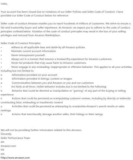 内容指出:“由于账号违反平台卖家政策和行为准则,目前已被关闭。为确保公平和值得信赖的买家和卖家体验,亚马逊要求卖家需遵守相关行为准则,一旦违反则可能导致涉事卖家失去销售权限并从亚马逊商城中移除。”