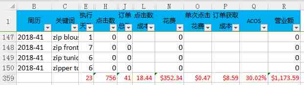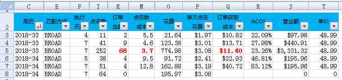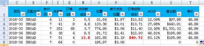 2,看Excel的第7行。该关键词(已隐藏)做满了一周7天的广告,产生51次点击,4个订单。平均每12.8次点击可以获取一个订单。当周广告花费162.88美金,平均每次点击单价是3.19美金,×12.8次=40.72美金=每个订单的获取成本!