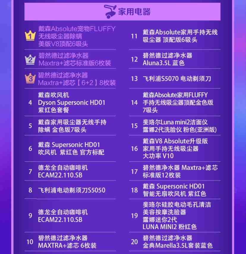 在家用电器销售额排行榜中,由戴森、碧然德、德龙、飞利浦、斐珞尔五大品牌盘踞。其中,戴森产品上榜8个,碧然德产品上榜6个,占据了榜单70%的位置。戴森顶配版宠物无线吸尘器的夺冠,戴森吹风机挺近前五,表明数字化时代居家产品的高端智能化倾向。多款碧然德过滤净水器的热卖,凸显出人们的高品质净水需求。德龙全自动咖啡机的畅销,也说明了消费者更愿意为生活情调来买单。