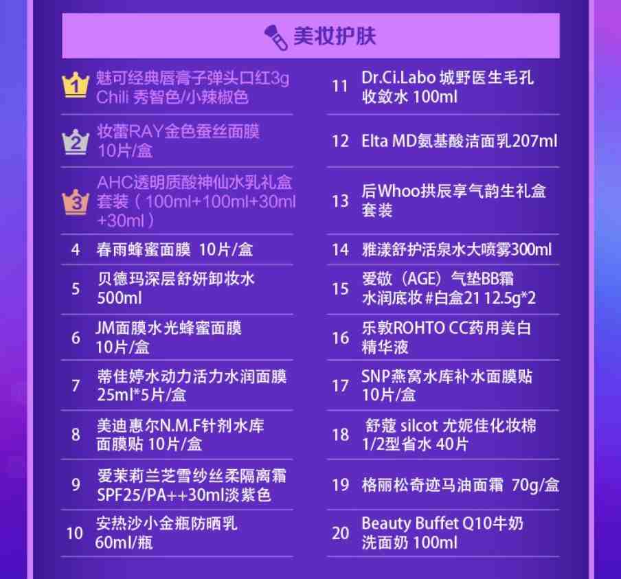 纵观面部护肤销售额榜单,魅可、妆蕾、贝德玛、后等大牌纷纷上榜,由此可以看出,美妆护肤越来越倾向于高端、品质化消费。而上榜的6款面膜,功能越来越细分化,不仅仅只是具有保湿、美白等传统功能。其中占据榜单第二位的妆蕾RAY金色蚕丝面膜,采用天然冷泉水、进口原生态蜗牛分泌液,以及深海优质海藻作为原材料,能够减少皱纹;位列TOP4的春雨蜂蜜面膜,87%都是蜂蜜原液,超级天然,能够赋予肌肤更多弹力;SNP燕窝水库补水面膜贴萃取燕窝原液,能够紧致嫩肤。由此可见专项功能型面膜越来越多,面膜的细分功能越来越明显。