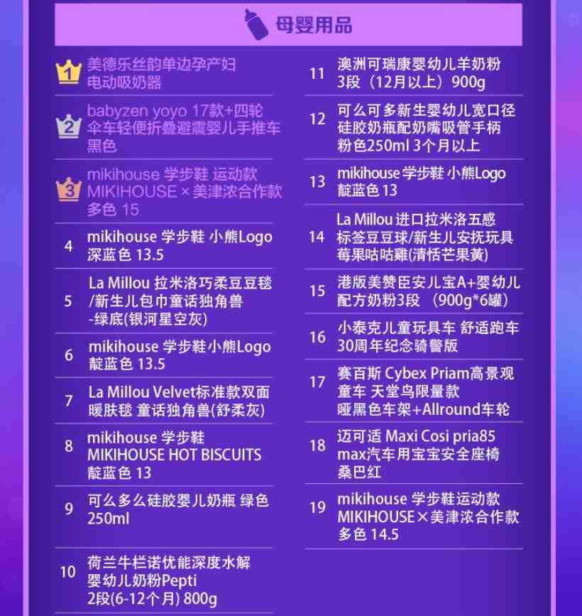 在母婴用品销售额增速榜上,6款mikihouse品牌的婴儿学步鞋纷纷上榜,“引导宝宝正确行走,减少行走负担”的理念俘获了宝爸宝妈的心。事实上,这也得益于昔日的80、90后大都已升级为父母,母婴消费习惯和观念都比较前卫,价格不敏感,更重视宝宝的健康成长。