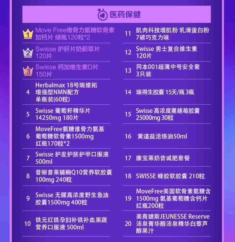在医药保健品类中,具有护肝片、护发护肤护甲口服液、鱼油胶囊等澳洲Swisse纯天然系列养护产品最受消费者青睐,在TOP20榜单中占据了40%的席位。国际保健调理产品得到了国内市场的充分认可,美从来都不只是外在的,内外兼修才能美得更长久,“外用护肤品,内服保健品”已经成为了人们品质生活的新风尚。MoveFree维骨力氨糖软骨素加钙片、MoveFree美国软骨素氨糖等上榜,也反映了国人对骨骼保健的关注。