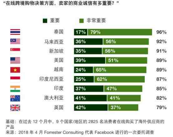 在接受调查的9个国家中,泰国、马来西亚和新加坡三国的消费者最关注诚信问题。这三个市场中超过90%的跨境买家认为,商业诚信是他们在线跨境购物决策中的重要或非常重要的因素。如果跨境卖家的目标为这三个东南亚国家/地区的消费者,则应该充分展现其商业诚信。