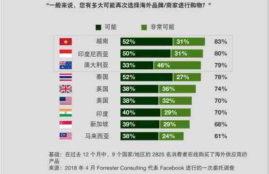 总体而言,在接受调查的2825名消费者中,有73%的跨境消费者表示可能或很可能再次选择海外购物,其中,越南、印度尼西亚和澳大利亚的消费者从跨境电商线上再次购买的占比最大。