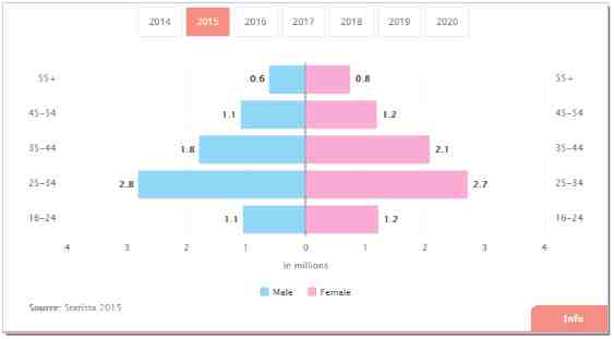 阿根廷的网购用户主要分布在25-34这个年龄阶段,并且与其他的年龄分段有着比较大的差别。