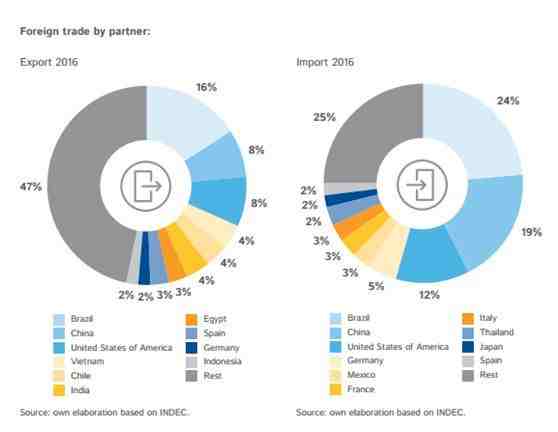 根据阿根廷统计局的统计,2016年中国是阿根廷第二大进/出口国,仅次于阿邻国巴西,两国合作空间巨大。