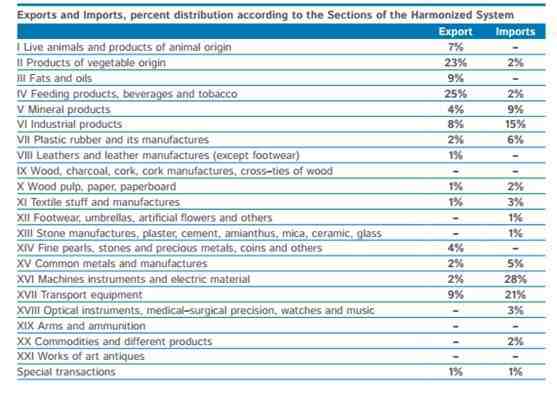 阿根廷进出口品类,可以看出,阿根廷以动植物制品、饮料与烟草、交通装备、脂肪与油、工业制品为主要出口品类(占总出口的82%),以工业制品、矿物、机械装备和电子制品、交通装备为主要进口品类(占总进口的73%)。