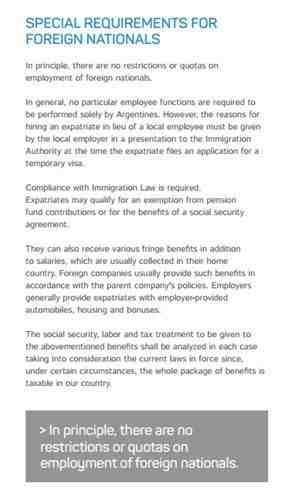 *阿根廷政府没有对雇佣外籍人员(外派劳工)进行限制,但本地用人单位需要向移民局解释雇佣外籍劳工而非阿根廷本国公民(从中国外派人员而非雇佣阿根廷本国人)的原因。被雇佣的外籍人员必须遵守阿根廷移民法。此外,外籍劳工可以享受阿根廷养老和社保基金的豁免。