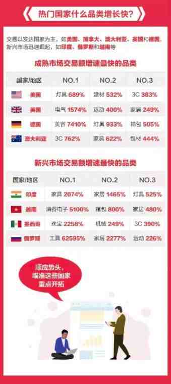新兴市场如印度、越南的家具、3C行业交易额增长20-50倍以上,俄罗斯的工具品类交易额增长超过600倍!