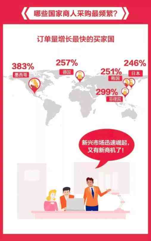 另外,为方便不同国家企业支付习惯,在采购节前夕阿里巴巴国际站联合多家银行建立了全球跨境大额支付网络,覆盖76%美国买家和41.4%欧洲买家。