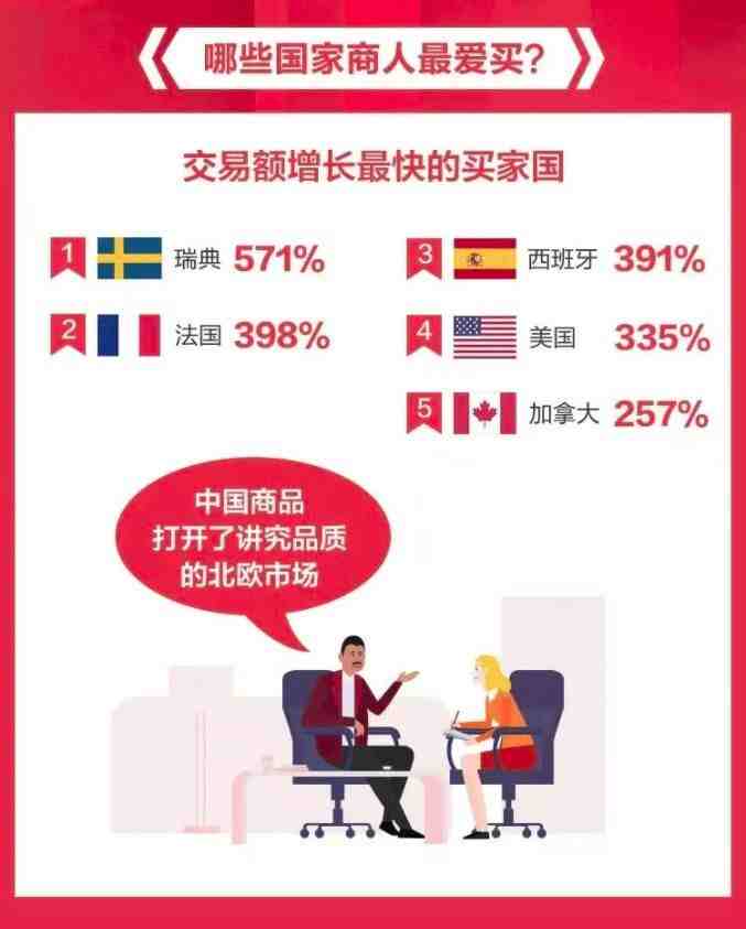 这次采购节总交易额同比增长近300%。其中北欧国家交易额增幅最大,近400%,瑞典在采购节第一周交易额增速位列全球第一,达571%。