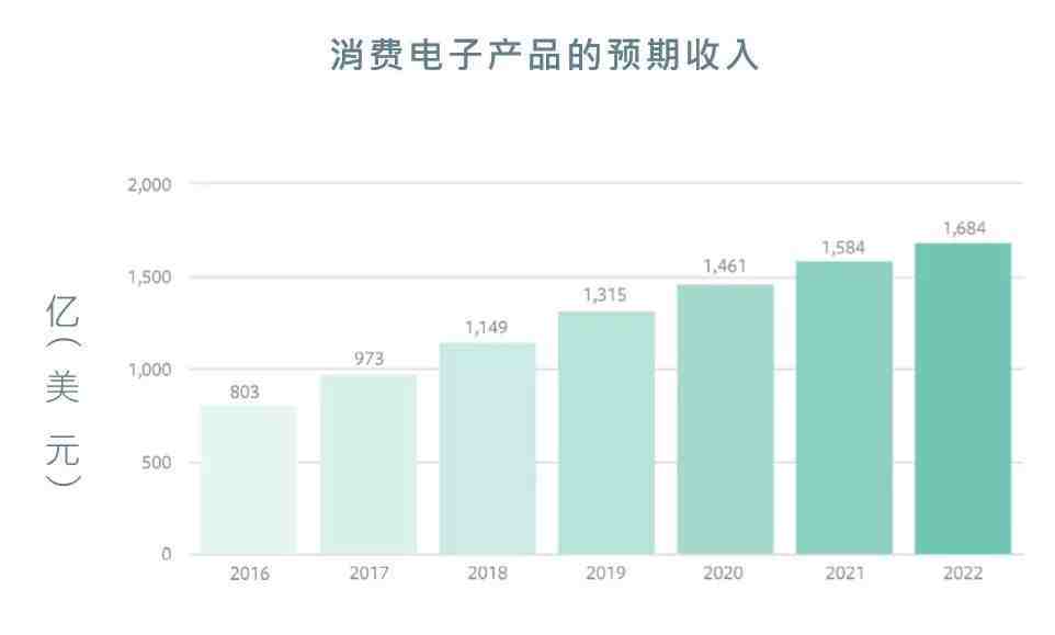 全球消费电子产品收入仍然保持每年超过 15% 的高速增长率,到了 2022 年,全球消费电子市场总值将会超过 1680 亿美元。拉丁美洲等新兴市场将会是中国消费电子产品的主要出口市场。