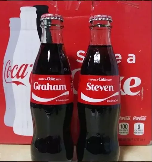 可口可乐的“昵称瓶”创意一度引发全民热议。比如它曾在每个瓶身贴上不同标签“#Share a Coke With…”(#和…分享这瓶可乐), “…”处是不同的昵称名字(通过用户提交自己的名字,以媒体收集的方式在各大媒体进行名字角逐,评出最后胜出的150个名字印在瓶身)