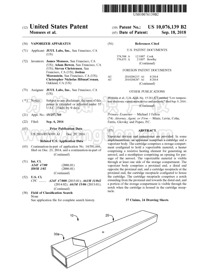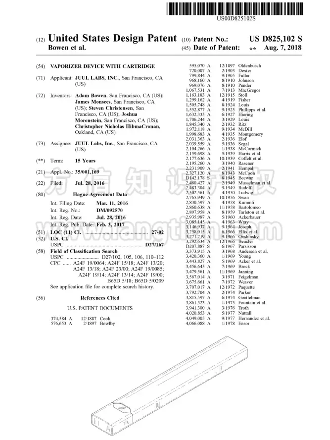 而JUUL电子烟能够一炮走红,其中的原因主要就是其打破传统而又别具一格的外观设计,美观精巧,携带极为方便。它不仅仅是电子烟,甚至是个性时尚的标志。因此,很受年轻人的青睐。 可能这时候大家心中的第一想法就是, 那它有申请专利吗?