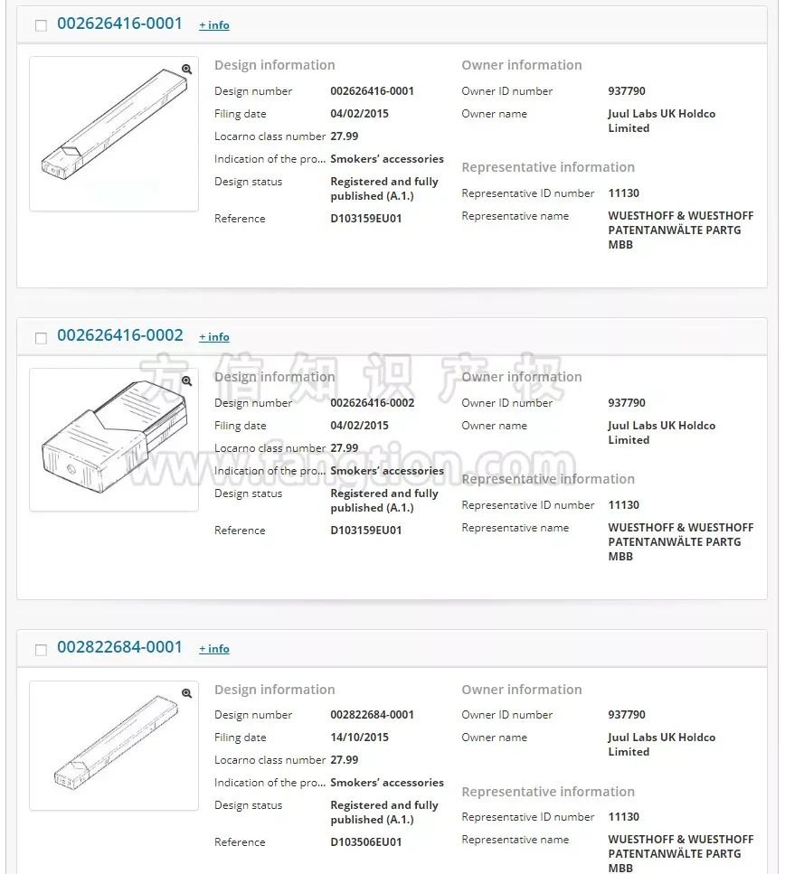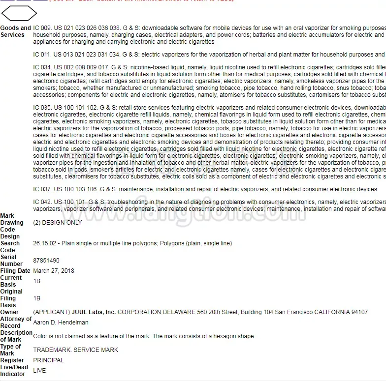 JUUL可以说在知识产权领域已经保护的比较全面了,不论是商标或专利都十分好的保护了起来。 值得我们国内电子烟卖家们参考学习!而追随者也需要警醒了哦!