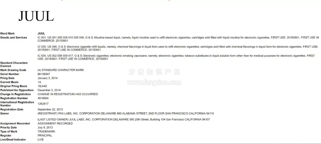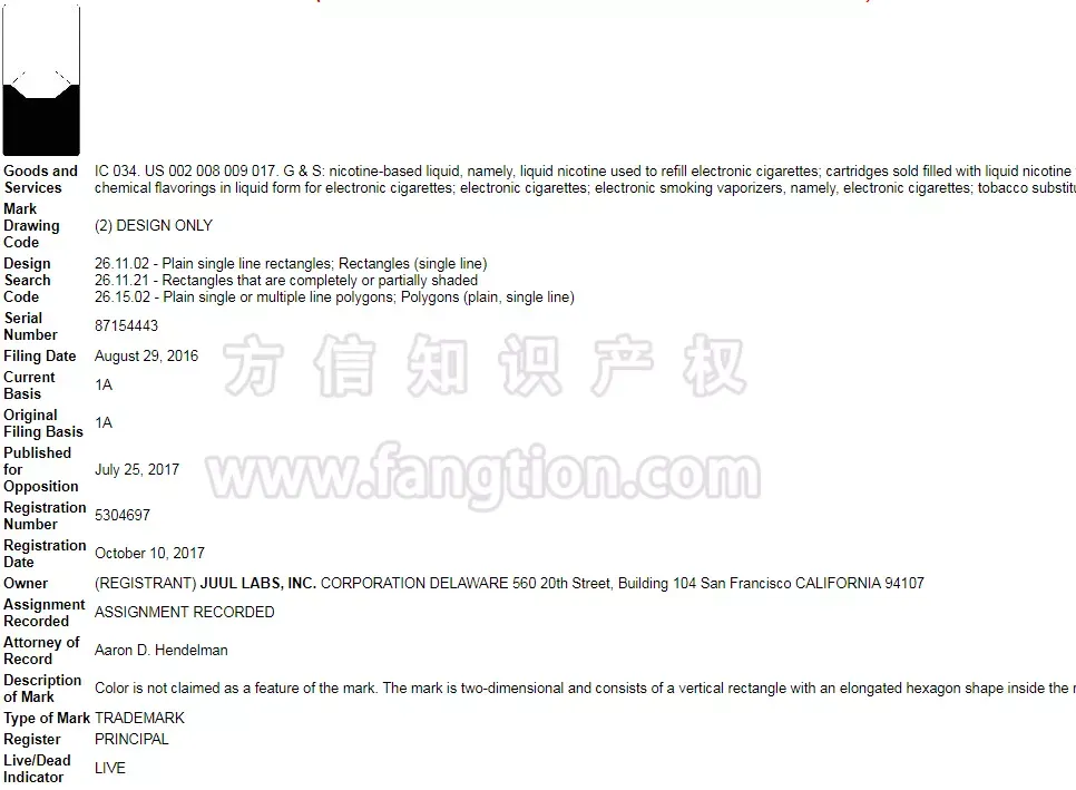 早在2015年,JUUL就已经在美国注册成功,完成品牌保护防线,为防止品牌侵权做好了预防工作。