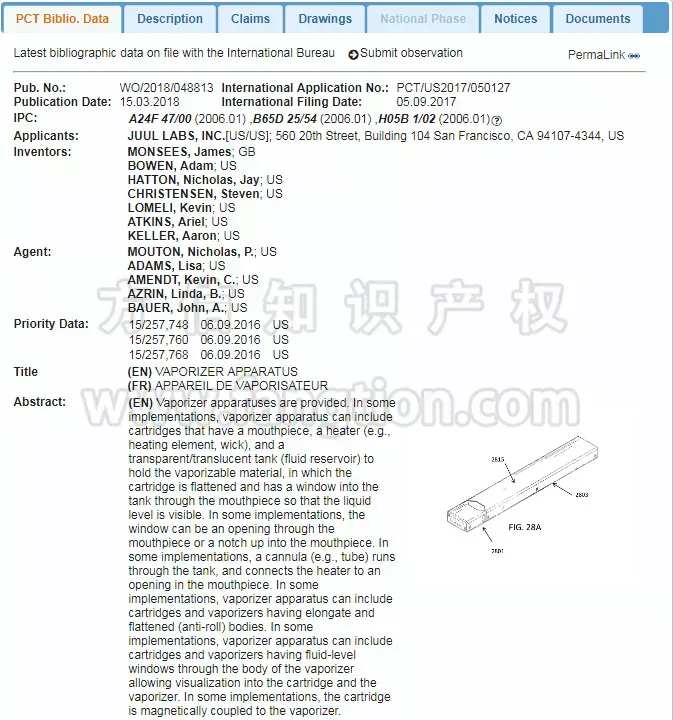 当然,JUUL LABS INC的电子烟拥有外观设计专利和发明专利, 其专利布局涉及全球多个国家。