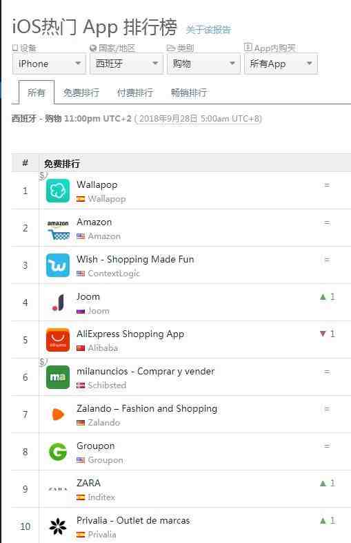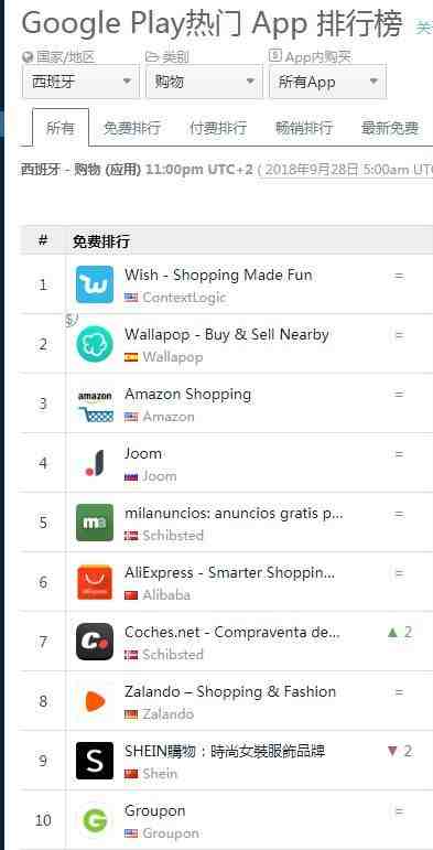 而根据App Anie数据,截至2018年9月28日,iOS热门购物App排行榜里面,排名前5名的分别为:Wallapop、Amazon、Wish、Joom、AliExpress。在Google Play热门购物App排行榜里面,前5名分别为:Wish、Wallapop、Amazon、Joom和milanucios。