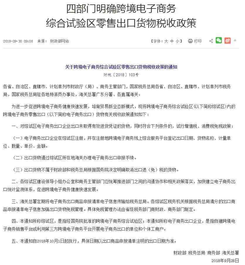 9月28日,财政部、税务总局、商务部 、海关总署四部门发布《关于跨境电子商务综合试验区零售出口货物税收政策的通知》(以下简称《通知》)。