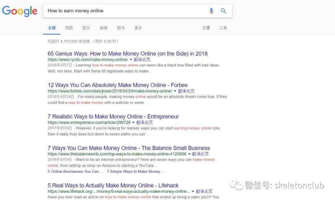 所以,对于想在互联网上赚钱的老外来说,他们第一位使用的是“Google”。谷歌搜“How to earn money online”。