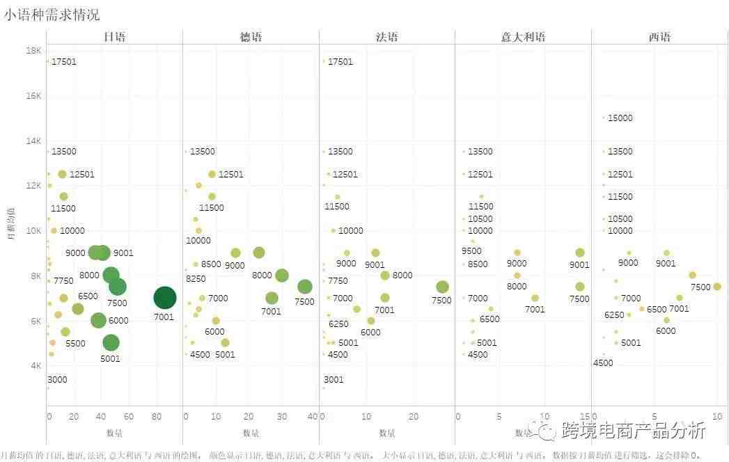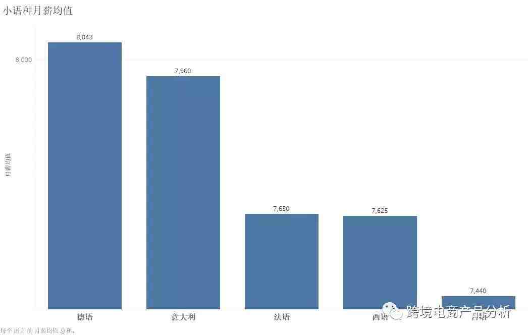 通过小语种的招聘需求可以发现,招聘者对于日语的需求明显大于欧洲小语种。而在欧洲语言中,德语的需求又比其它更强。究其原因,不难看出,日本站是这两年发展较快的一个站点,且当地人民对本地语言客服的要求较高。拥有一个懂日语的运营,无疑对做日本站是各很大的帮助。而欧洲的情况不太明朗,因为VAT税号封店铺的新闻让人忧心忡忡,很多卖家都降低了在欧洲的销售预期。同时部分站点销量平平,但市场较大的德国站依然保持着领先位置。如果想要获得更好的薪资水平,可以利用业余时间学习第二外语,增加个人核心竞争力。经过比较月薪均值,欧洲小语种高于日语。查找原因发现,欧洲小语种有招聘运营经理的需求,因此拉高了月薪均值。