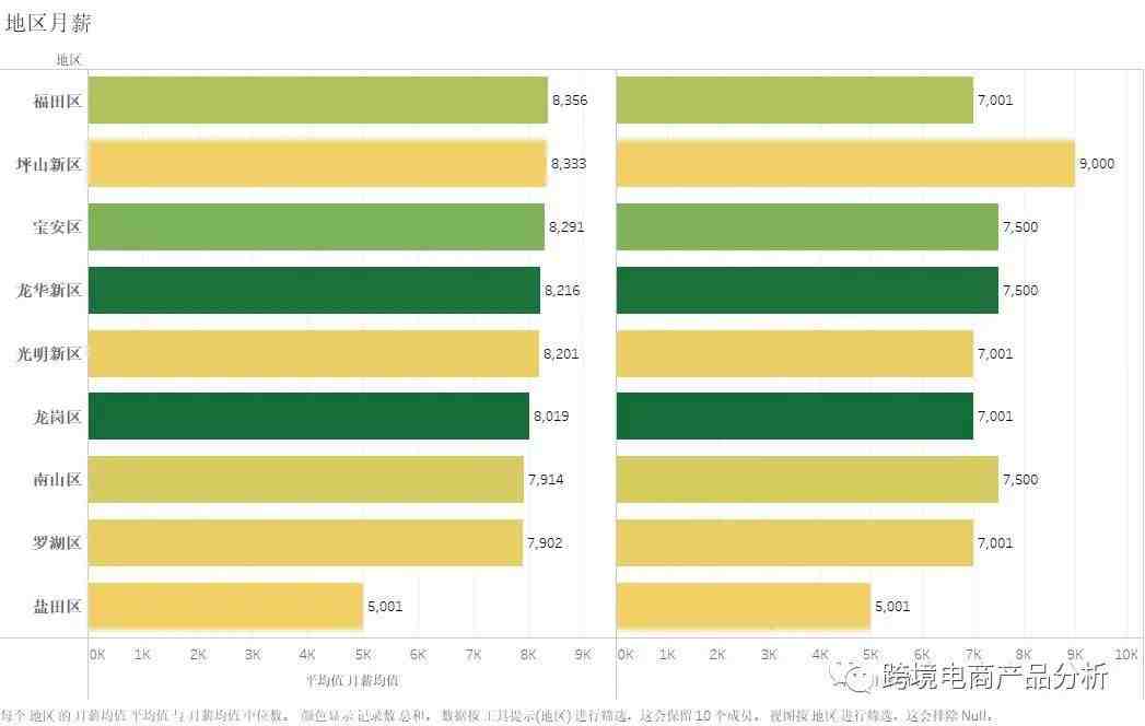 接着看各地区的招聘数量和工资水平。如图,可以看出,龙岗,龙华,宝安等关外地区招聘的需求比较多(颜色越深,招聘需求越多),而关内的招聘数量明显少于关外。工资水平用均值和中位数两个指标来对比的话,没有很明显的差异,说明这个行业的平均薪资应该在7-8K这个水平,而盐田由于数据样本较少,不太精准。所以,在龙岗,龙华和宝安地区求职的选择更多,成功率更大。