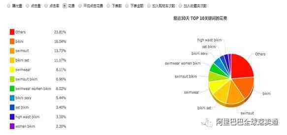 从这一组词语当中,我们可以看出bikini这个词,它的消费占比达到16.04%。而Womanbikini占比才2.20%。那么从这项数据我们可以知道这一组关键词的消费不均衡,大词抢占了更多的消费从而是其它关键词不能得到应有的曝光和点击。那这时候应该适当的对消费高的关键词做价格降低出价,消费不够的词语进行提价使它们能达到一个均衡的消费值。