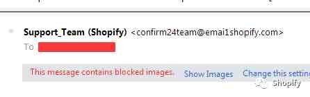 在Yummy反馈的邮件信息中, 第一封钓鱼邮件稍稍有些低级,不过应该也能骗到一些人,发件人为Support Team (Shopify) <confirm24team@emai1shopify.com>
