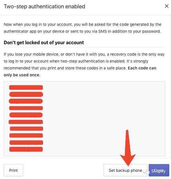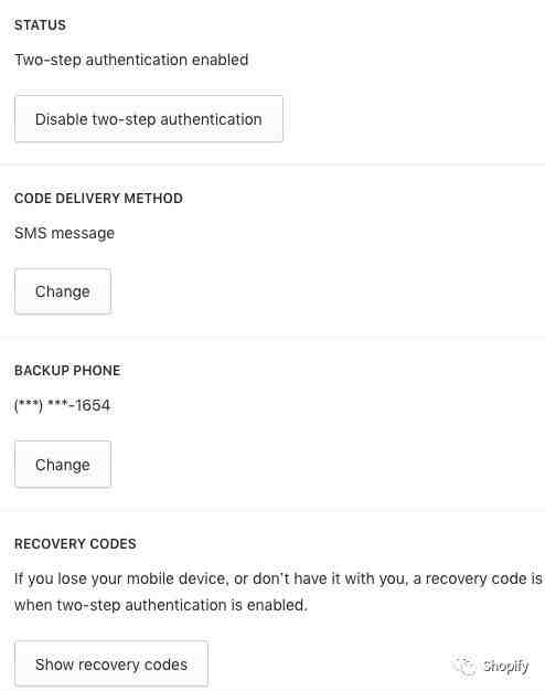 完成设置之后,你还可以,点击Disable Two - Step Authentication 取消账户的二次登录验证,或者修改用于接收验证码的手机以及备用手机,或者点击Show Recovery Codes,显示Shopify自动生成的10个备用的Code。
