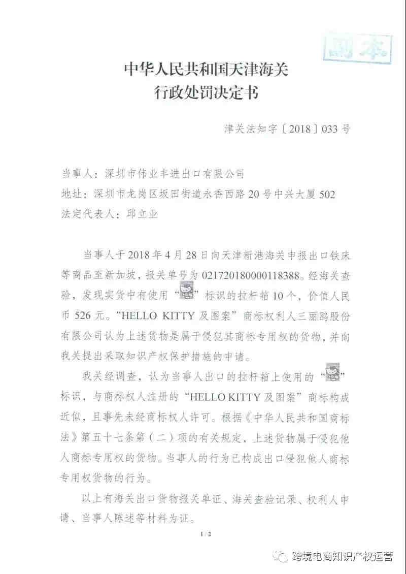 近日,天津海关发布了“关于深圳市伟业丰进出口有限公司出口侵犯“HELLO KITTY及图案”商标专用权拉杆箱案行政处罚决定书”,编号为津关法知字〔2018〕033号) 。