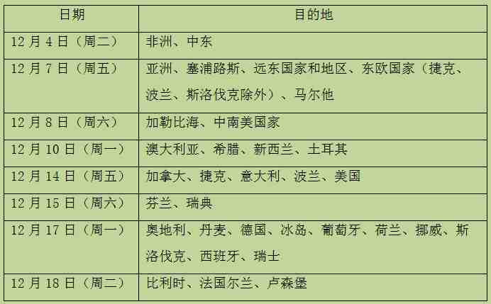 1、 国际经济快递(International Economy)各目的地在2018年圣诞节前最后一次收件时间