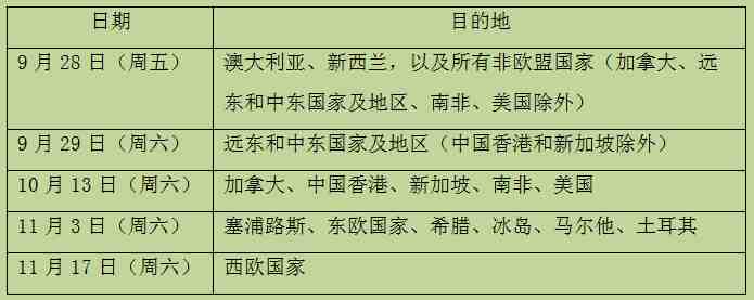 以下是英国皇家邮政公布(Royal Mail)的——2018年圣诞节前各个目的地的最后一次收件时间,其中有一些目的地的收件时间就在9月底。