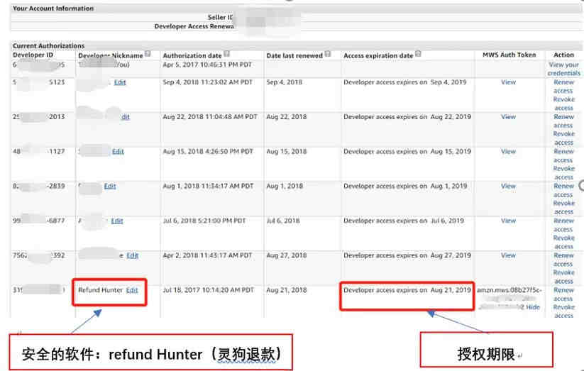 而子帐号授权方式,是通过第三方开发者账号进行授权(需要在亚马逊上以服务商主体注册开发者账号),是在亚马逊的有效监控下进行的,会列明在MWS账号授权列表里,会有开发者注册的名称(RefundHunter),这些授权是有访问权限及有效期的限制,过期后需要重新授权,亚马逊可以有效的对这部分授权进行监控并管理。