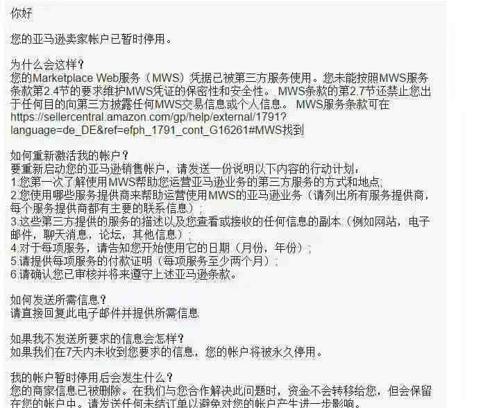 从邮件可以看出,这次亚马逊大规模关铺是因为您的MWS授权给第三方软件的时候,违反了wms2.4条款,从亚马逊中国官方人员获悉,2.4条款就是不允许卖家给第三方软件终身的API授权,只能是有期限的开发者授权。