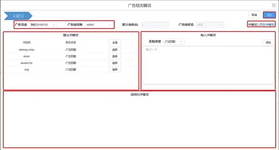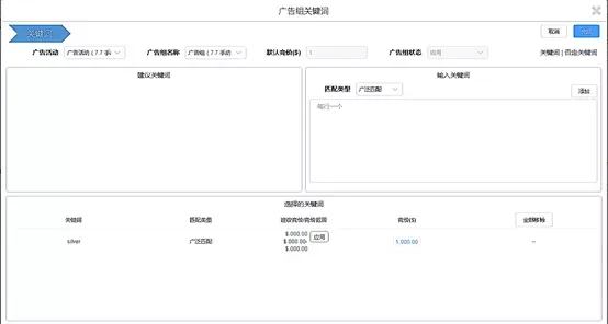 点击添加关键词,在跳出的【广告组关键词】界面中添加新的关键词或者否定关键词。
