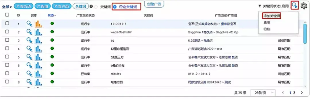 可以对关键词进行批量操作(启用、暂停和归档)。