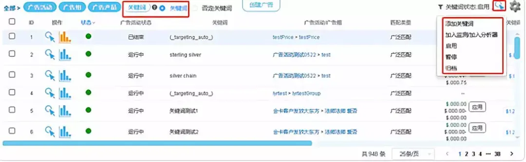 ,可以对关键词进行加入监测/加入分析器、暂停和归档。