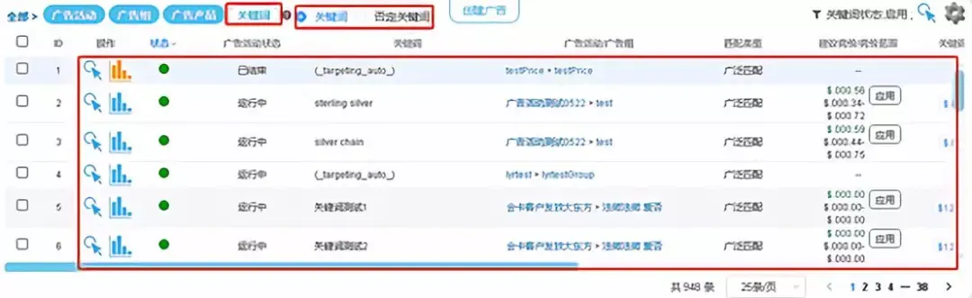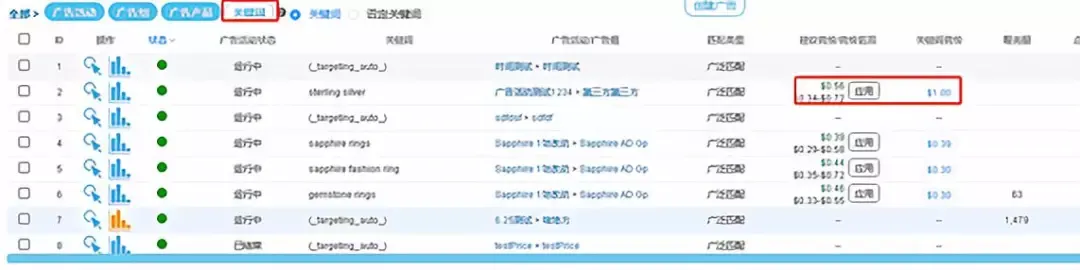 在关键词列表中,看到【操作】列和各属性列,关键词竞价可以修改,也可以应用建议竞价。选中一个关键词,选中操作列中的按钮(