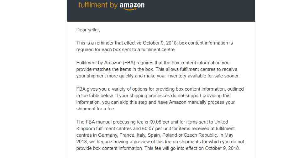 没有产品信息的商品需要亚马逊帮忙贴上,当然这不是免费的,会根据国别不同收取0.06-0.07欧元的手工处理费用。