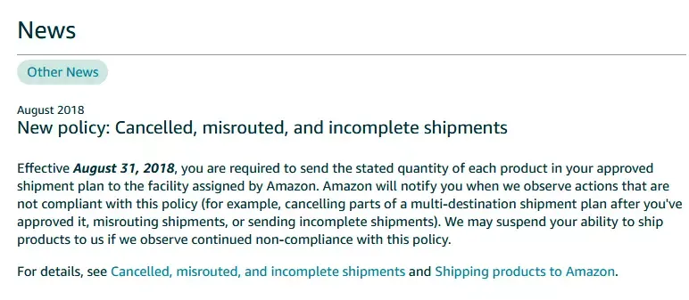 2018年8月31后之后,分仓之后的所有货件都需要发货,如果只发其中一个仓库,那么30天 内亚马逊未收到其他仓库的货件的话,亚马逊将通过电子邮件通知卖家其货件不符合此政策。如果有取消货件,或者部分发货,错误发货的现象,亚马逊将取消卖家发货的权利。