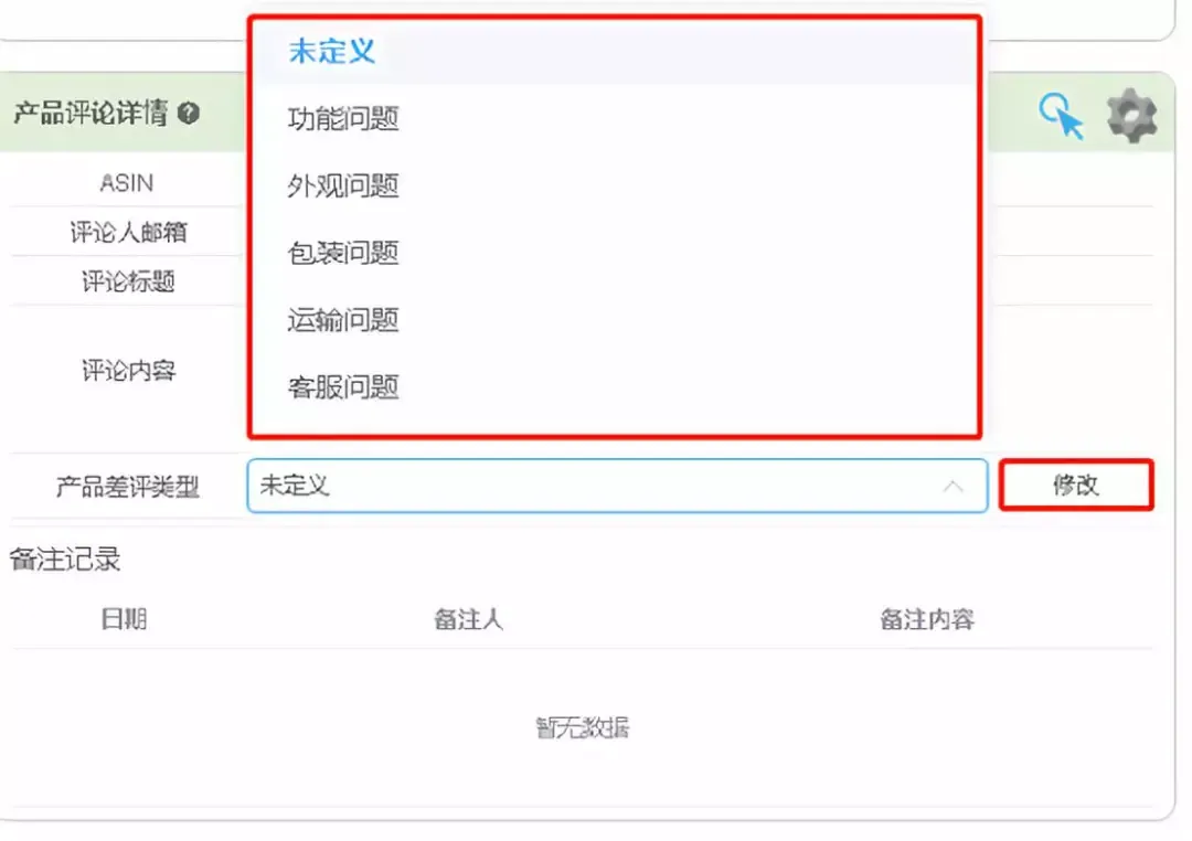 点击产品差评类型,选择相应的类型,点击修改,进行产品差评类型的修改操作。