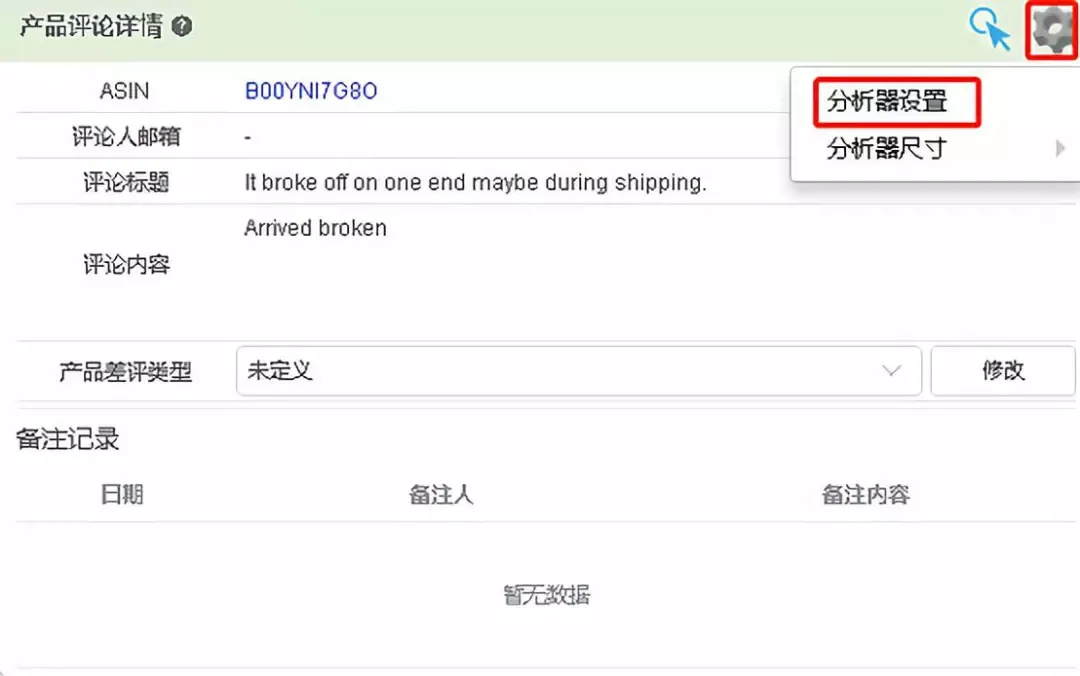 产品差评类型可以在分析器设置里修改,点击分析器设置,进入分析器设置页面。