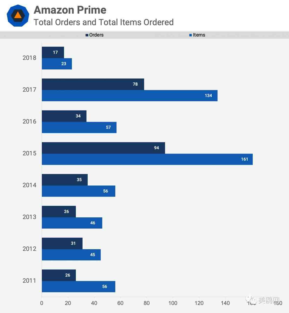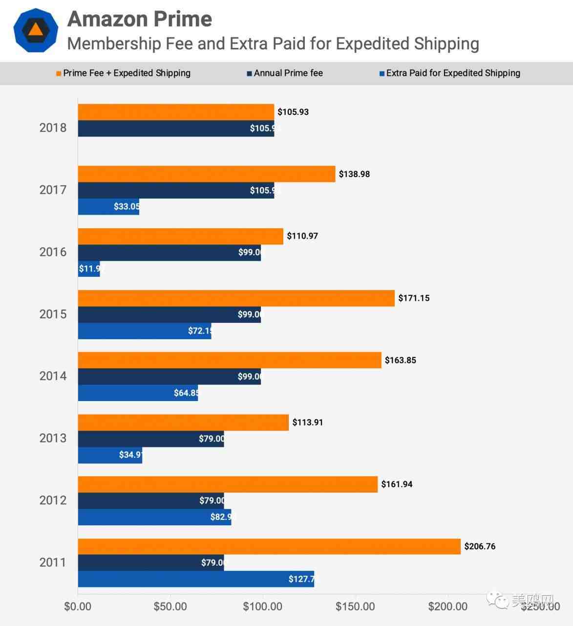 在这里,我们可以看到每年为Amazon Prime支付的费用,以及我为选择购买的一天支付的额外运费。值得注意的是,在最初两年的Prime服务中,我支付的额外运费比会员的总费用还要多。