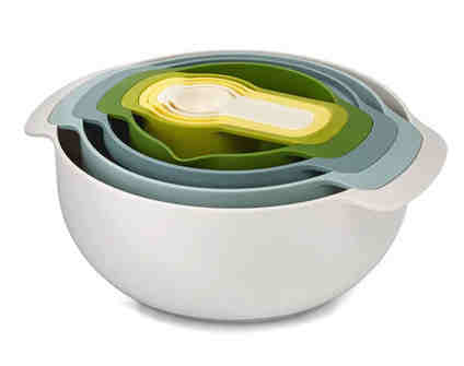 无论怎么叠放,厨房的碗具似乎都会占去不少的空间,但这套筑巢碗几乎在最大程度上节省了餐具的存放空间,其中包括9件用品,含碗、量杯、滤碗等,一应俱全。你可以毫不费力地把他们叠放在一起,节省橱柜空间。