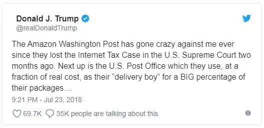 据外媒CNBC北京时间7月24日最新报道,在美国当地时间7月23日下午,特朗普总统再次通过推特发文抨击贝佐斯,指责亚马逊利用美国邮政服务,将其作为自己的“送货员”。让亚马逊受到反垄断指控的可能性再次提高。 与此同时,特朗普总统在推文中还特别强调了USPS(美国邮政署)对亚马逊包裹收费过低,从本质上来说,亚马逊一直在享受USPS的服务补贴。 以下是特朗普发布的两则推文: 从该推文中我们可以看到,特朗普认为,自从亚马逊在美国最高法院输掉了互联网税案官司之后,《华盛顿邮报》就疯狂地反对我。接下来是美国邮政服务,亚马逊将其作为廉价送货员,用超低的成本递送大量包裹。” 此外,特朗普通过推文补充道:“…在我看来,《华盛顿邮报》只不过是亚马逊的昂贵(这份报纸亏损了一大笔钱)说客。它是否被用作许多人认为应该提起反垄断诉讼的保护措施?” 特朗普推特文中所说的“互联网税务官司”指的是今年6月份,美国最高法院裁定,各州(无论有无实体)有权从互联网销售中征收税款。事实上,这一裁决在很大程度上未对亚马逊造成影响。 长期以来,特朗普一直呼吁对亚马逊进行增税。今年1月份,特朗普表示,亚马逊的主导地位正在损害美国零售商的利益。亚马逊已经在其所销售的产品的每个州征收销售税,这占其网站上所有销售的产品的大约一半。 最重要的是,特朗普一直认为,USPS为亚马逊提供了过多的帮助,导致了USPS的财政亏损。对此,USPS应该提高起对亚马逊的服务收费,以提高财政收入。但USPS方面表示,特朗普关于USPS为亚马逊配送包裹遭受损失的说法是不准确的。但这似乎并不能改变特朗普的想法。 另外据卖家之家获悉,有外媒曾报道特朗普称亚马逊对邮政服务的定价结构不公平。今年4月,特朗普签署了一项行政命令,成立了一个专责小组,负责审查USPS的运作和财务,并提出改革建议。 很显然,特朗普针对的不仅仅是亚马逊,对其创始人贝佐斯更是深有成见,我们也可以看出特朗普在暗示未来将对亚马逊采取反垄断行动。不知道作为亚马逊的卖家,您怎么看? (卖家之家整理/编译:危伟) 声明:本文首发于卖家之家网站(MJZJ.COM)并由卖家之家作者整理和编译,转载本文不得修改标题及原文,并保留来源以及原文链接,否则我们将保留追索权利。