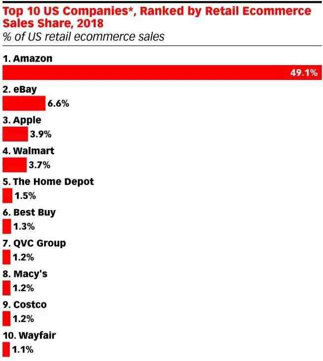 我们看一下,今年美国10大电商企业所占的市场份额↓