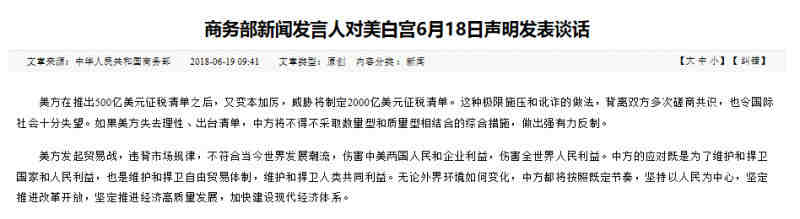 特朗普政府在上周五表示,将对中国出口的500亿美元商品征收25%的关税。中国则声称美国发动了一场贸易战,并立即采取了报复行动,宣布将对价值500亿美元的美国商品征收关税,而且列出了关税清单。